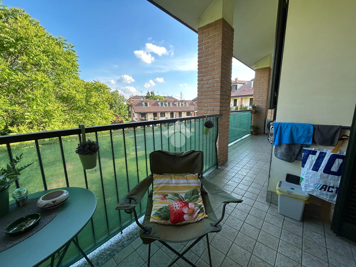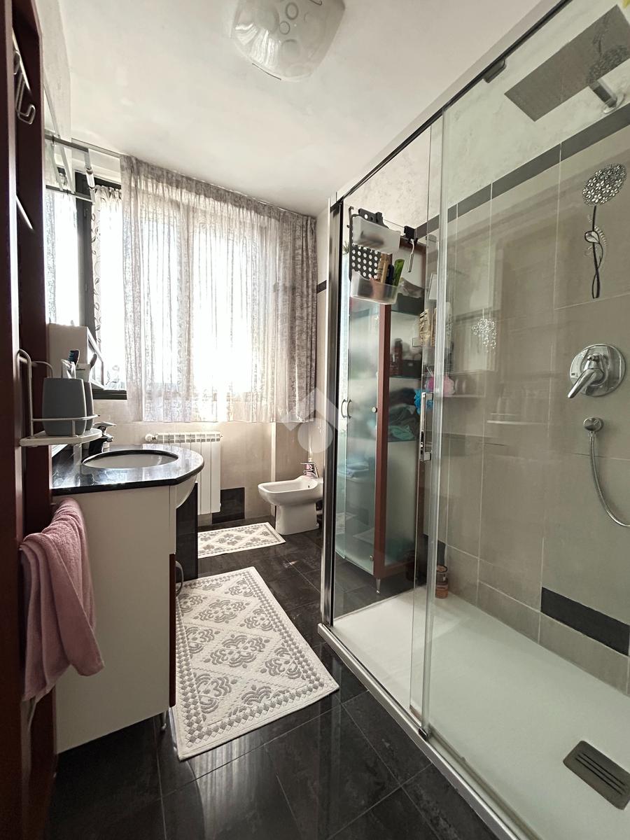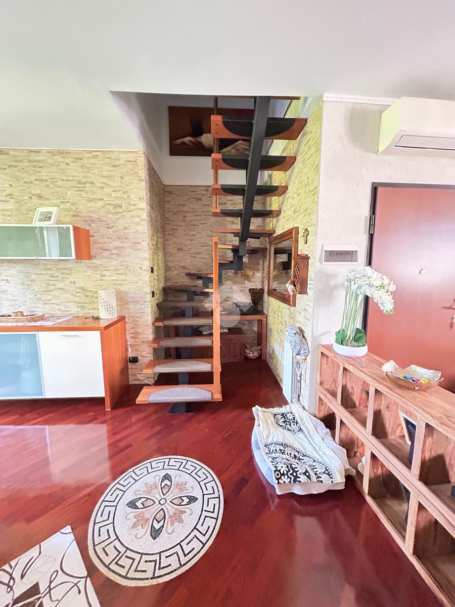 La cucina è separata, valorizzata da eleganti porte di design, e si affaccia sull’ampio balcone che serve tutto il piano. Completa il livello un bagno finestrato, anch’esso curato nei minimi dettagli.