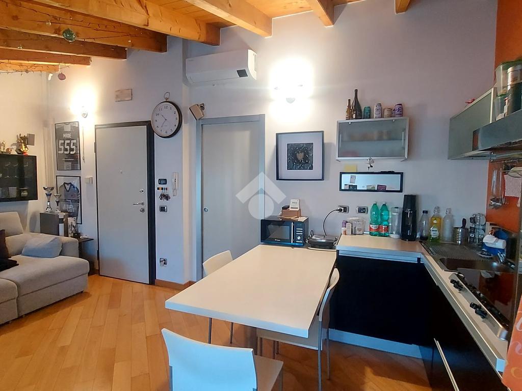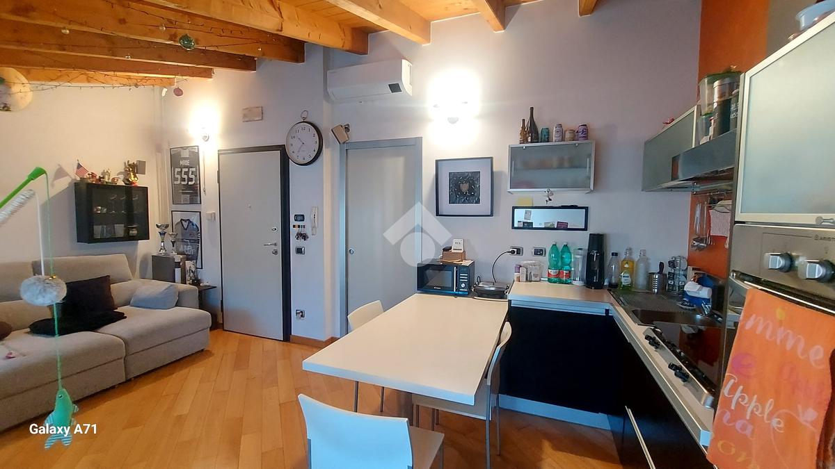 L’ingresso si apre su un luminoso soggiorno con cucina a vista, caratterizzato da due finestrelle originali che affacciano sul cortile interno e donano un’atmosfera davvero suggestiva. Le travi a vista conferiscono all’ambiente un fascino rustico e accogliente.