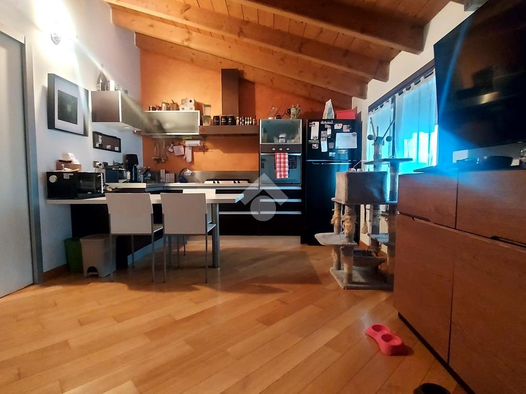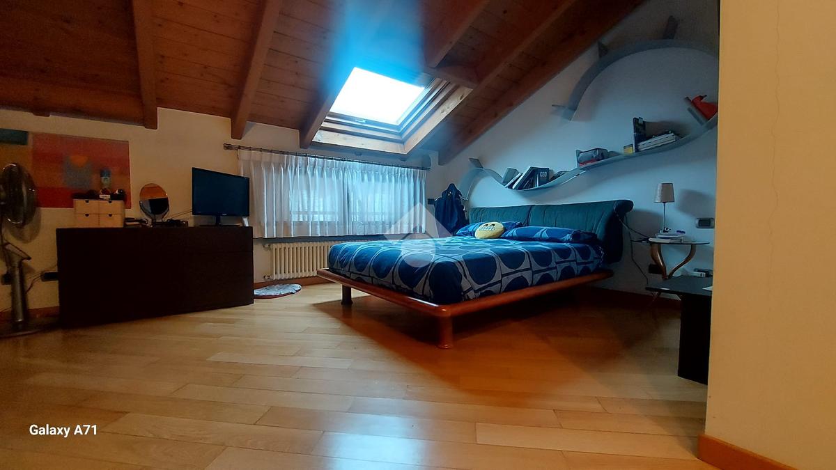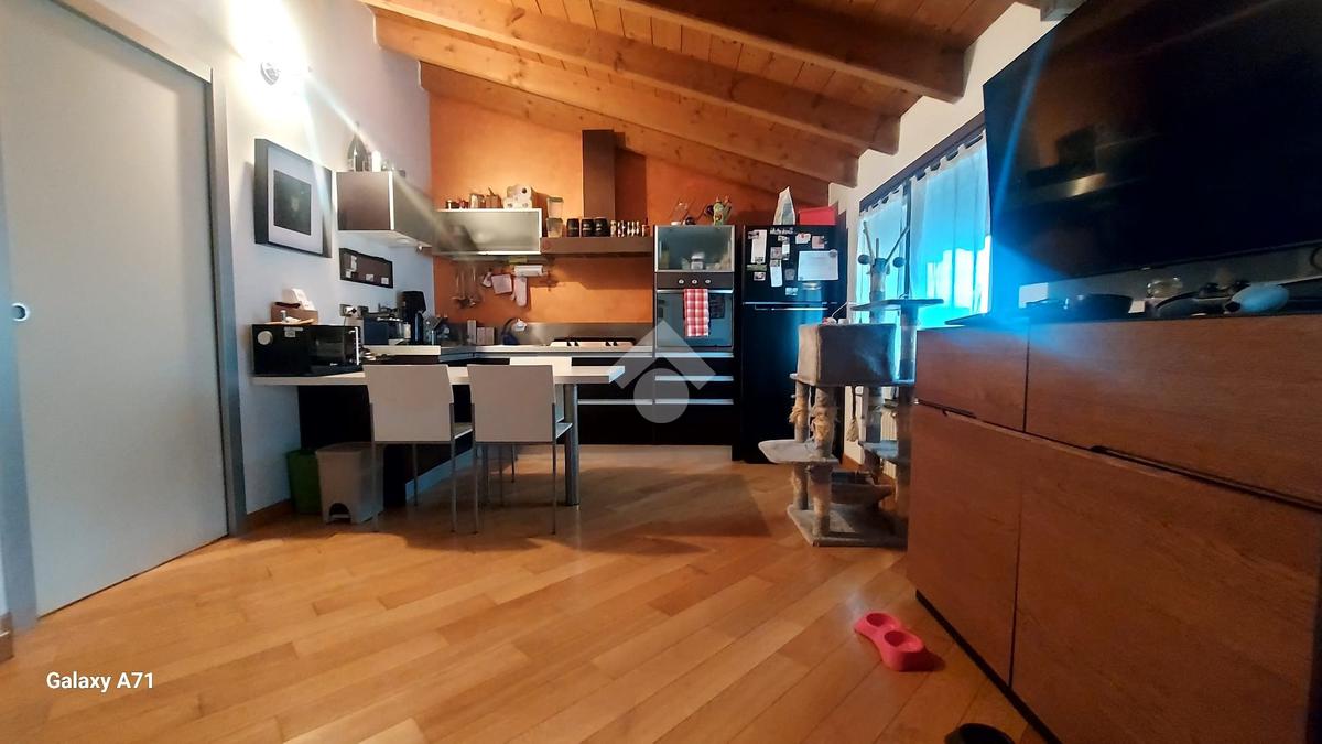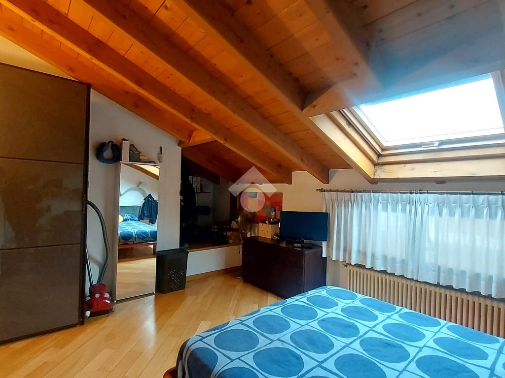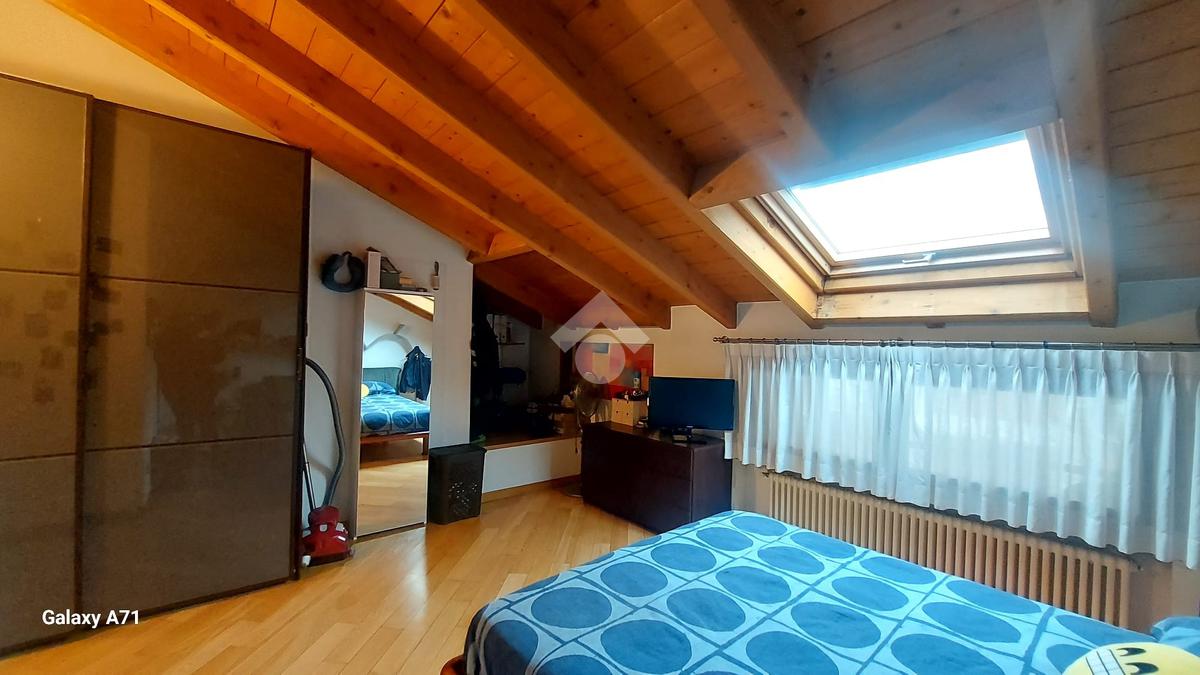 La soluzione è contraddistinta da una zona giorno ben distribuita, l'ambiente risulta molto armonioso in quanto tutto l'appartamento è contraddistinto da travi a vista; tramite il disimpegno di accede alla zona notte completa di bagno con box doccia e velux elettrico e di un'ampia camera matrimoniale, anch'essa completa di velux sul tetto e di due finestre, che, come nella zona giorno, rendono l'ambiente molto luminoso ed arieggiato.