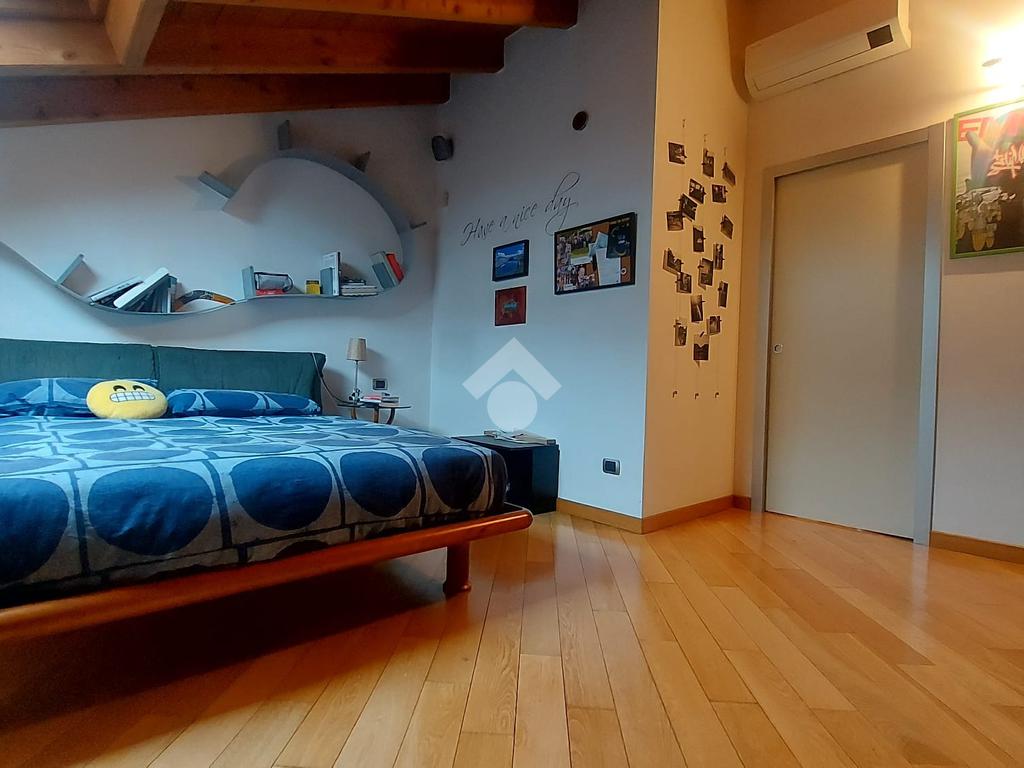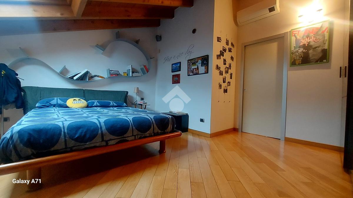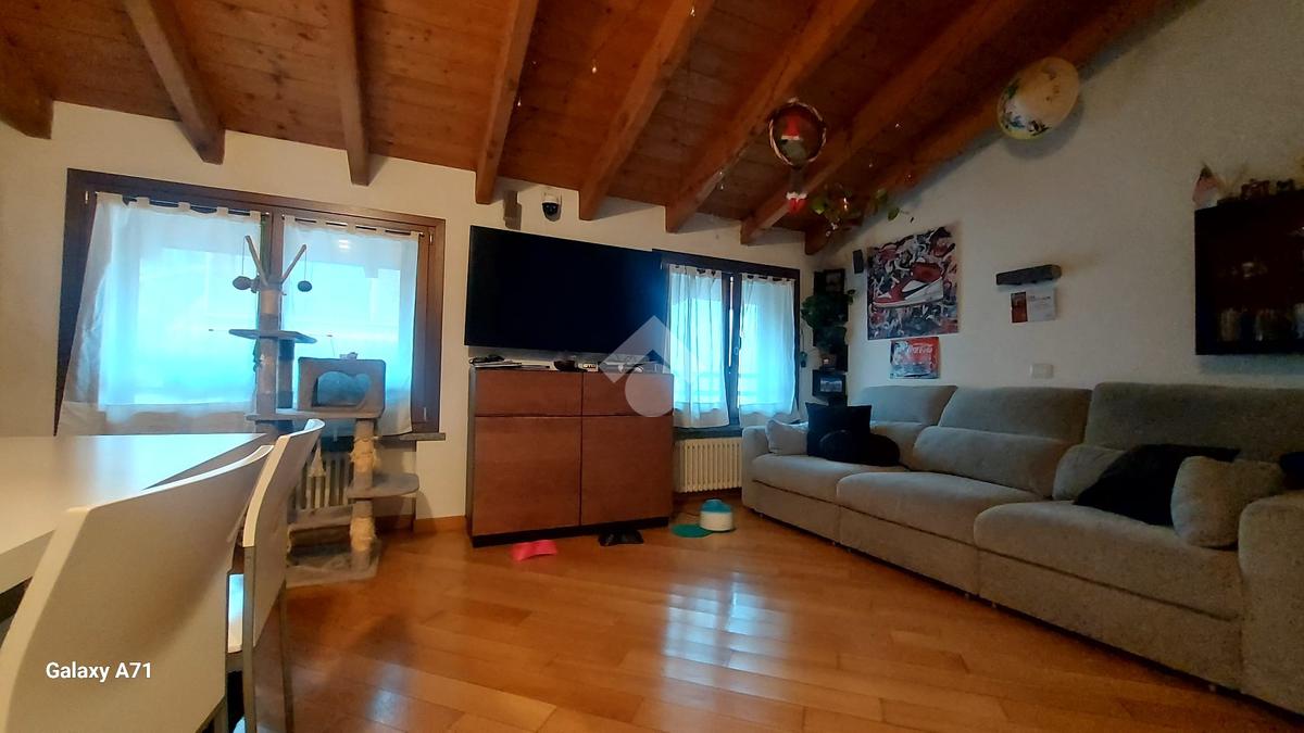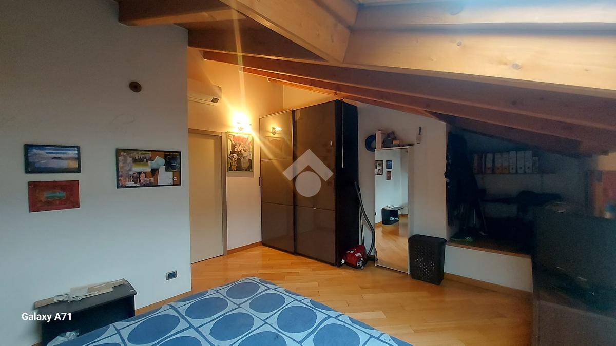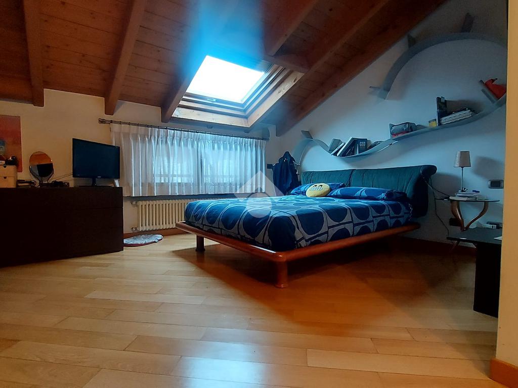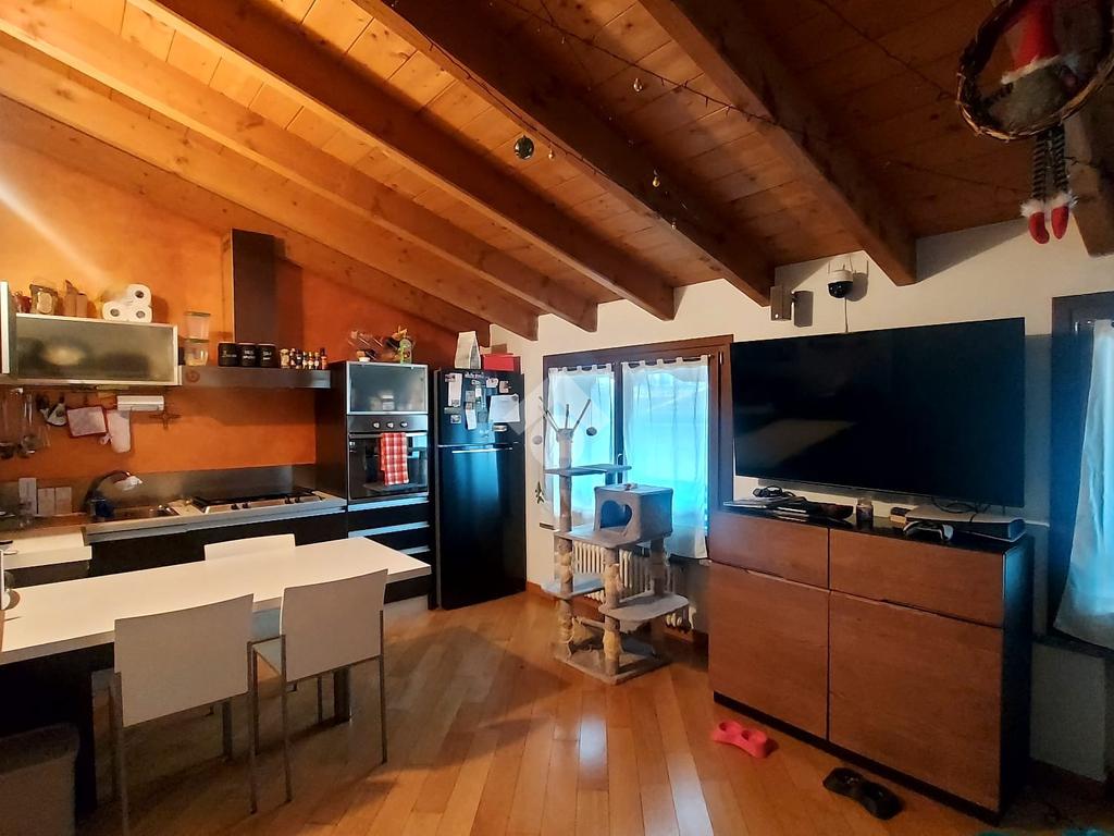 La soluzione è contraddistinta da una zona giorno ben distribuita, l'ambiente risulta molto armonioso in quanto tutto l'appartamento è contraddistinto da travi a vista; tramite il disimpegno di accede alla zona notte completa di bagno con box doccia e velux elettrico e di un'ampia camera matrimoniale, anch'essa completa di velux sul tetto e di due finestre, che, come nella zona giorno, rendono l'ambiente molto luminoso ed arieggiato.